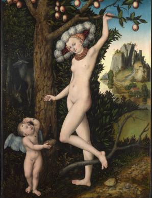 So the title feels forced. As does most of the selection it describes. Yes, Cranach’s poster image of an elongated Venus smiling knowingly at the fate of her reckless son, Cupid, who has stuck his hand into a honey pot and is being stung by the bees as his reward, may warrant the description. But little else. This is as much a show about what is missing as it is about what is there.