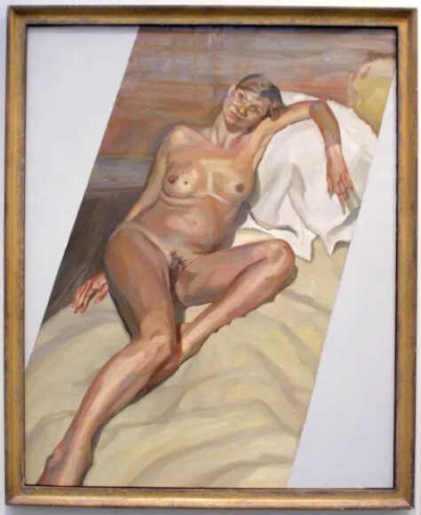 He, meanwhile, is waiting for her at the National Gallery, where she eventually finds him — in the first of many late arrivals — standing in front of Titian’s Diana and Actaeon, a painting in which a doomed hunter is surrounded by a harem of naked Greek nymphs. Freud mumbles something deep about nudity and beauty and we know immediately that as sure as tits is tits Kate will end up modelling for him naked. And of course she does.