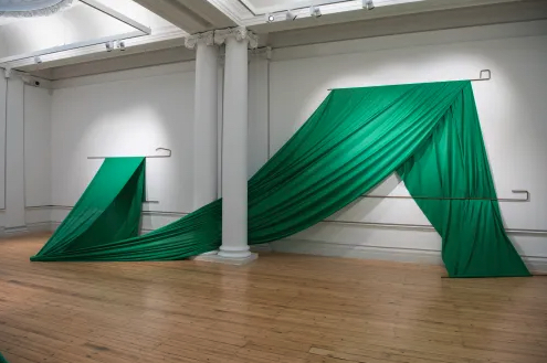 It’s a recurring mood. Alia Gargum is from Libya. Her contribution is a tower of flapping green fabric entitled This Was a Mosque. The specific tonality of the green, the green of flags and Arabian domes, feels as if it started out with spiky ambitions to bring up Islamic issues. But somewhere along the line, it decided to be elegant instead.