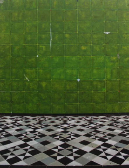 A little further down the wall, but still working the rich Giovanelli seam, Ally Fallon shows us the junction between a tiled floor and a tiled wall. The floor is geometrically decorated. The wall is plain green. Nothing else happens in the picture. But just as vacuums suck in oxygen, so architectural emptiness draws in our imaginings.